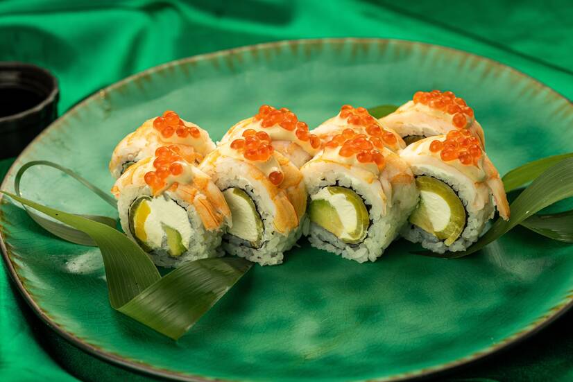 Рис, норі, креветка, крем-сир, авокадо, дайкон, васабі соус, ікра червона