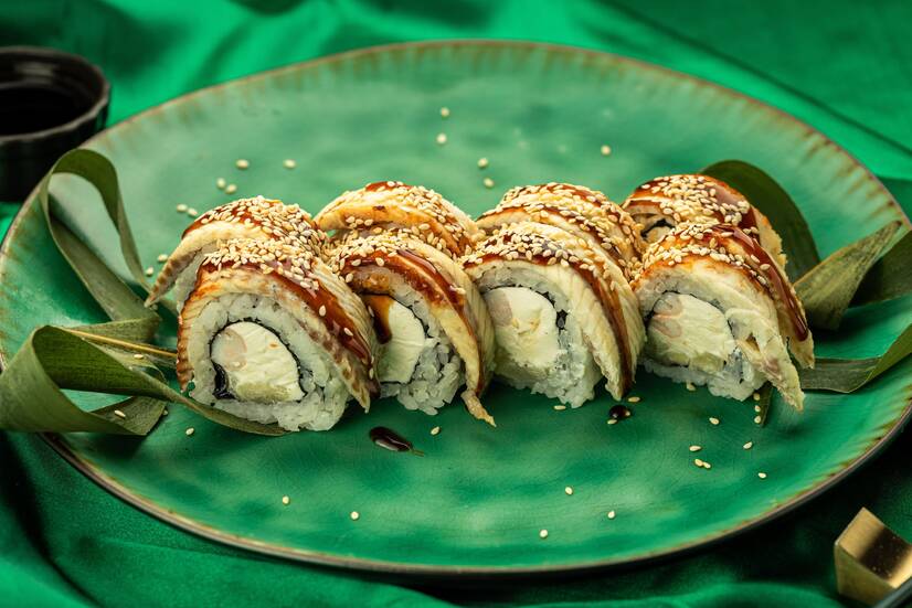 Рис, норі, крем-сир, ананас, вугор, креветка, соус унагі, кунжут