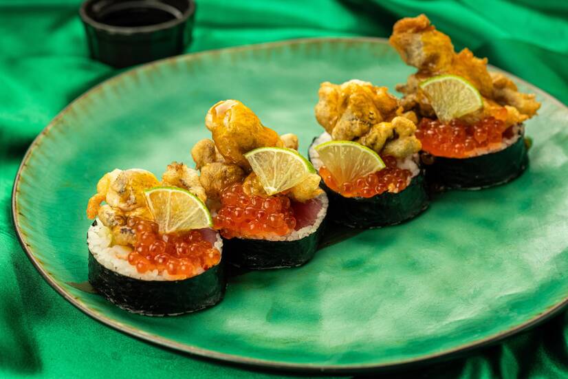 Рис, норі, крем-сир, креветка, манго, груша, восьминіг, червона ікра, манго-чилі, лайм, тунець