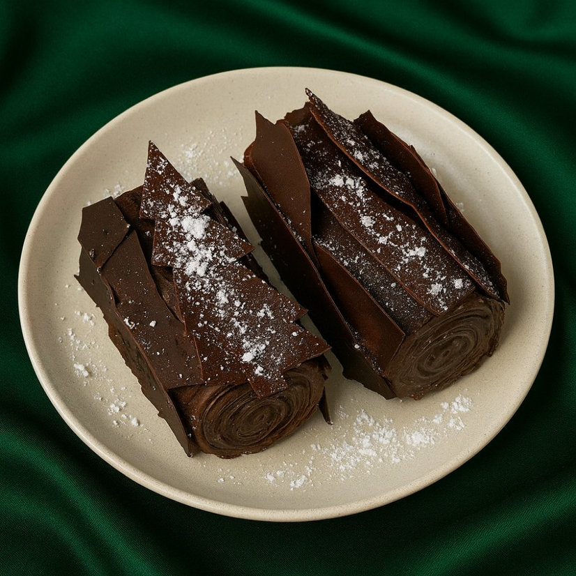 Всередині вологий шоколадний рулет з коньяком, з шоколадним заварним кремом, п'яною вишнею та хрумкою шоколадною корою