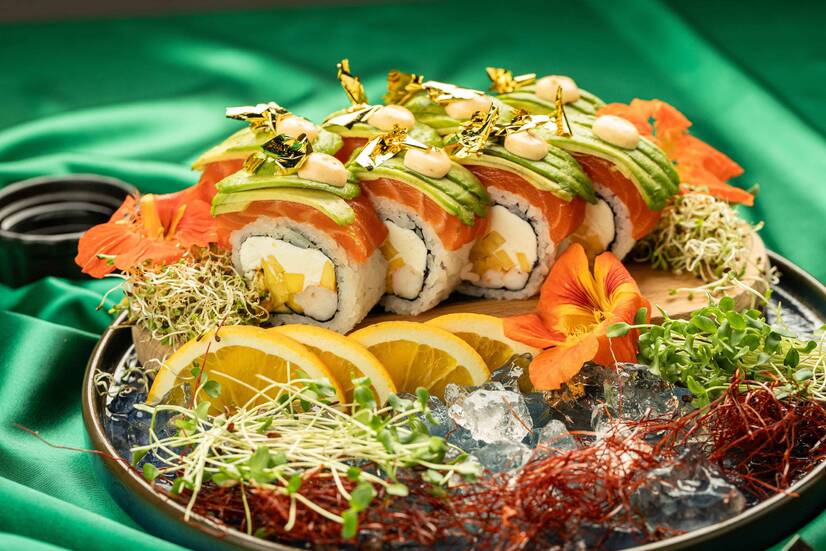 Рис, норі, крем-сир, фісташка, креветка, манго, лосось, авокадо, соус спайсі, сусальне золото
