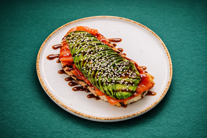 Тост, лосось, крем-сир, авокадо, соус унагі, кунжут