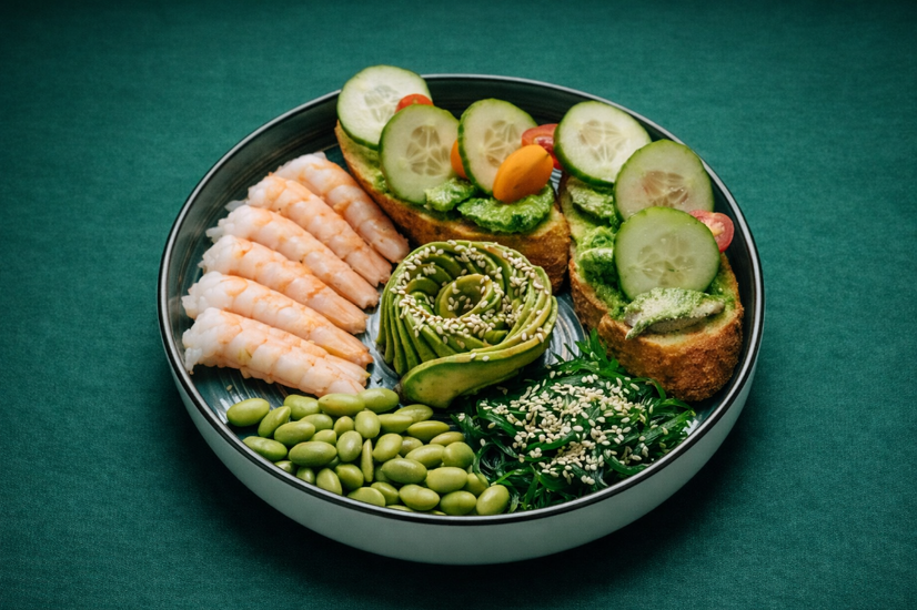 Креветка, крем-сир, боби, салат чука, чері, авокадо, огірок, кунжут, тост, соус манго-чилі