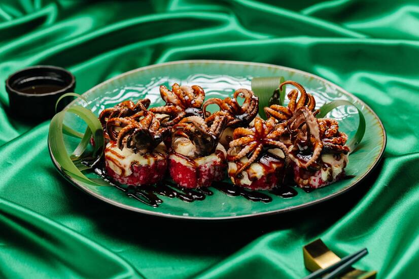 Норі, рис, крем-сир, ікра масаго, омлет томаго, груша, восьминіг, соус унагі, сирна шапка