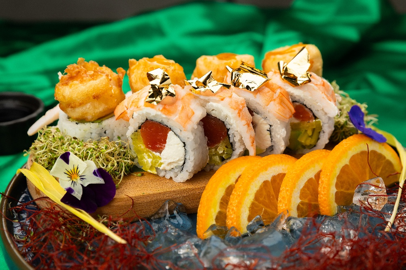Норі, рис, крем-сир, авокадо, дайкон, креветка, лосось, гребінець темпура, соус манго-чилі, соус спайсі, сусальне золото