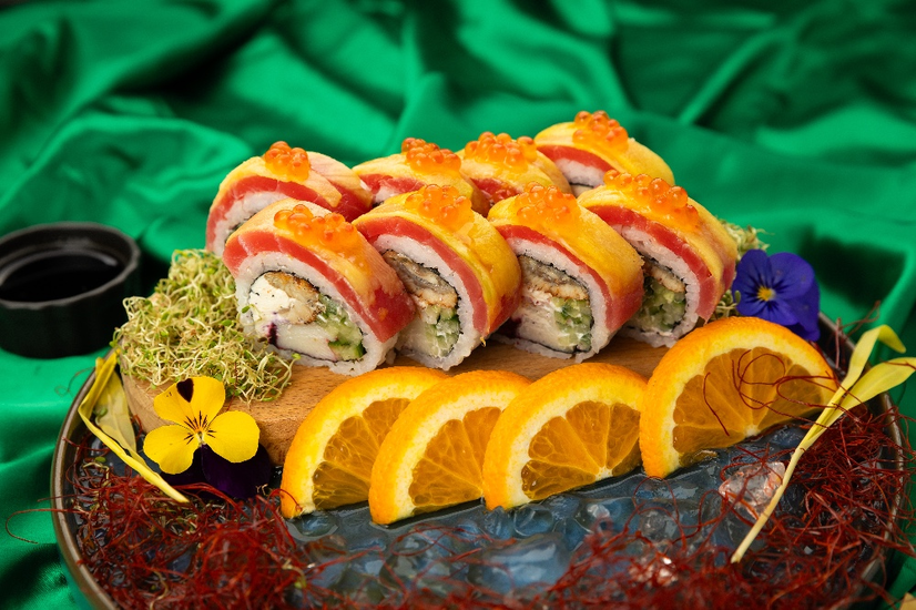 Норі, рис, крем-сир, тунець, вугор, сніжний краб, огірок, сублімована смородина, червона ікра, манго